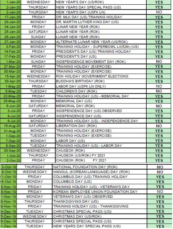 아래의 표는 2020년도 USFK (주한미군사령부) 공식 카투사 휴일 입니다. 하지만 쉬는 날들이 정해져 있기 때문에 매년 많은 변동사항은 없습니다. 따라서 이 표를 참고하시면 카투사들이 대충 언제 쉬는지 알 수 있는데 연말에 집중된걸 보실수 있습니다. 아까 위해서 언급했듯이 제가 추천 드린 달에 입대를 하게 되면 겨울을 두번 하게 되고 이 황금같은 연휴들을 군대에서 두번 보낼수 있기 때문에 굉장한 장점이라고 생각합니다.