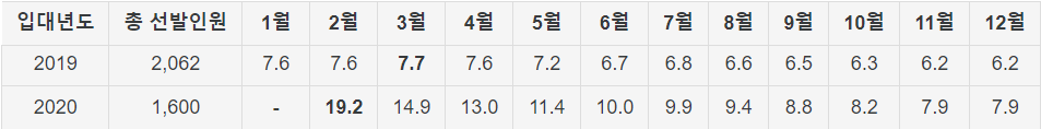 - 2020년도의 평균 경쟁률은 10.5 : 1 이며, 해가 바뀔수록 경쟁률이 올라감. (기존 2,000 명 선별, 현재 1,600명 선별)